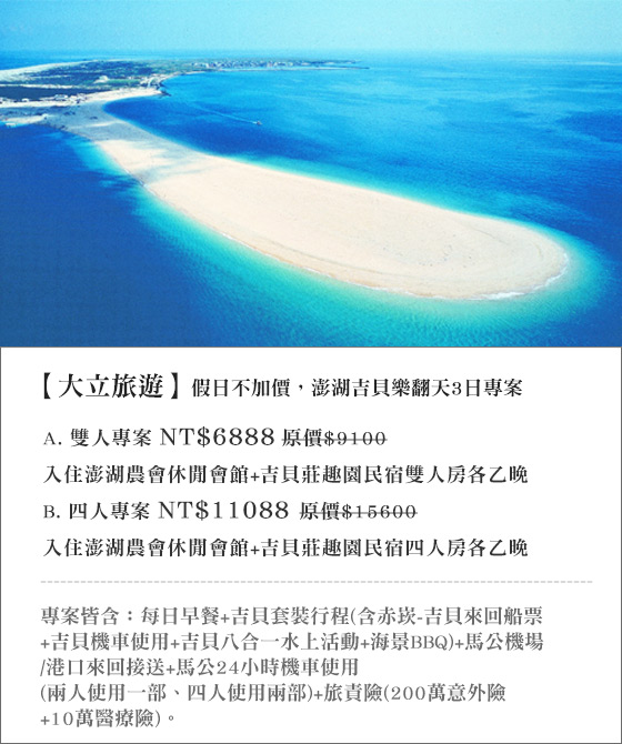 .....大立旅遊-假日不加價,澎湖吉貝樂翻天3日專案(農會+莊趣園)哪裡買最便宜.心得文.試用文.分享文